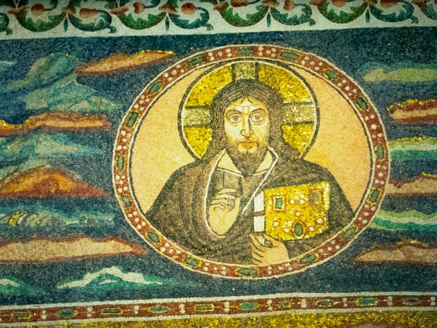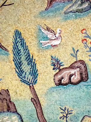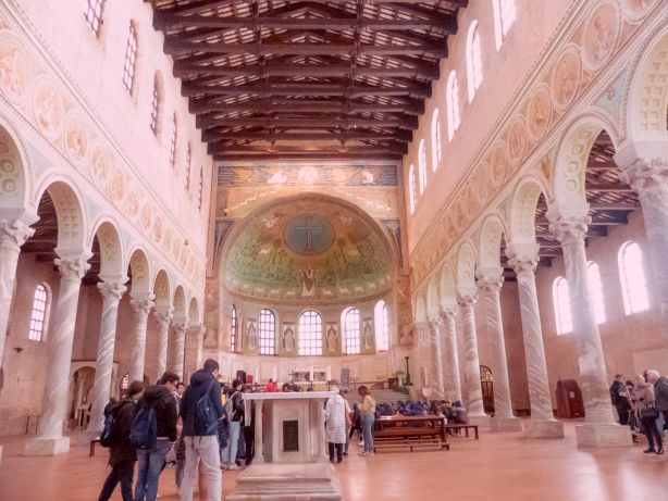 kerk'. Een kaartje kopen en naar binnen. Een grote ruimte. Je bent in de linker zijbeuk. Aan de overzijde de zuilen voor de rechter zijbeuk. Van achter in de kerk ga jenaar het midden. Een stralende open ruimte. Aan de voorzijde de absis, overkoepeld door een 'kwart bol', een groot groen mozaiek. Een soort triomfboog vormt de toegang. In