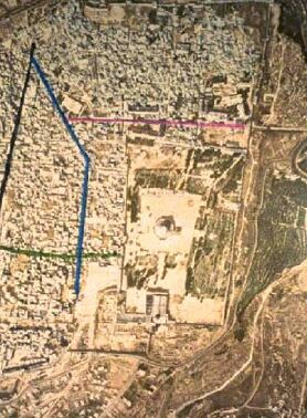Het complex vanaf de noordkant van de Olijfberg gezien. Je ziet de ommuurde ruimte: voorhof der vrouwen. Daar ontmoette iedereen iedereen.